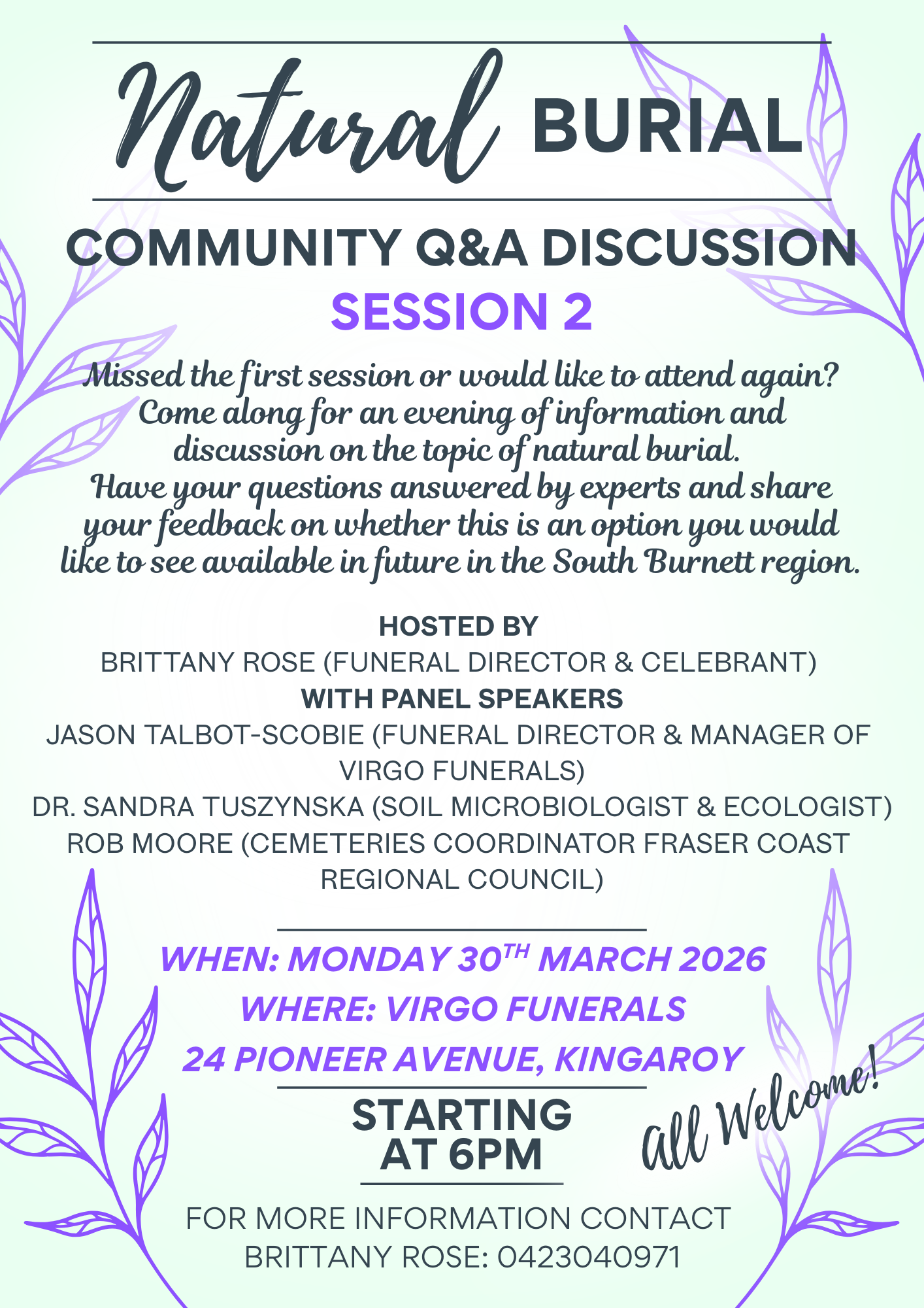 The Community Q&A events in February and March 2026 are designed to create awareness of an alternative disposition method in the community, and garner the community’s feedback to the concept. The next step will make making a proposal to council to either extend an existing cemetery, or allocate land to establish a new natural burial cemetery in the SOuth Burnett.